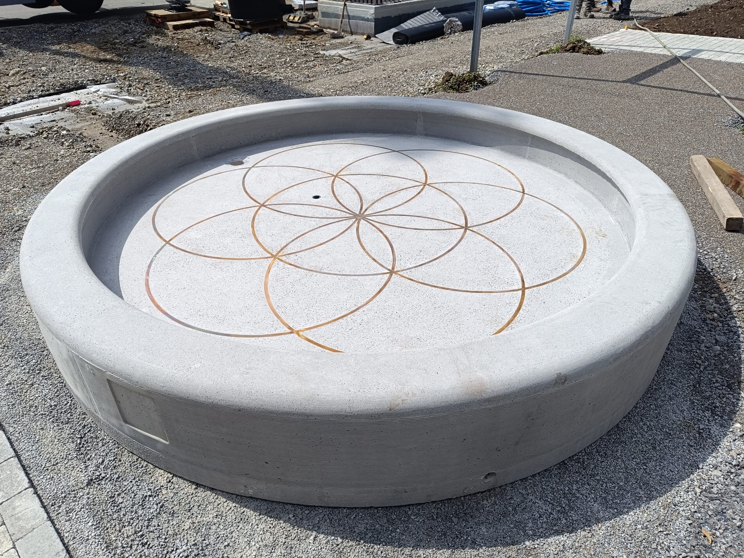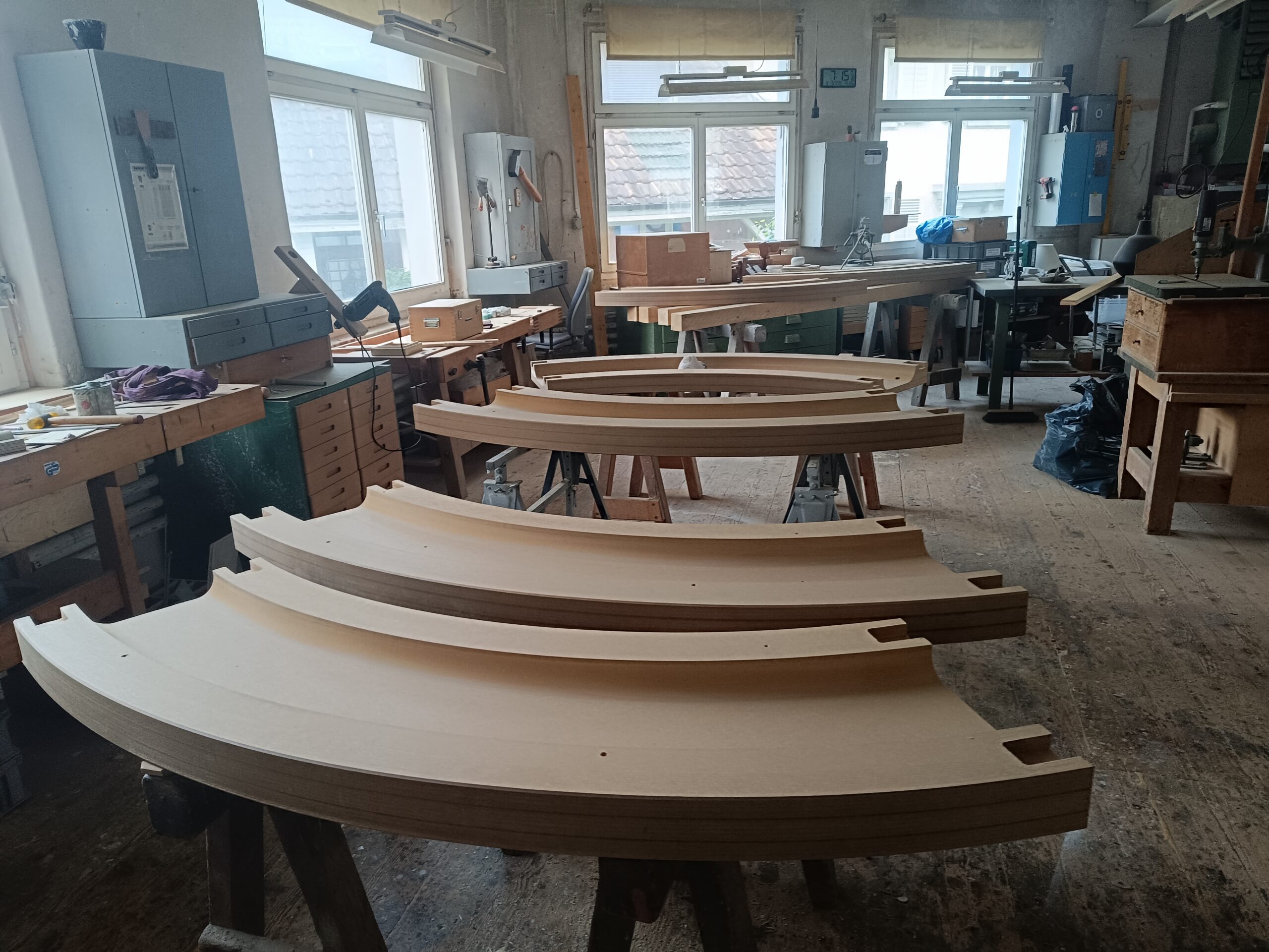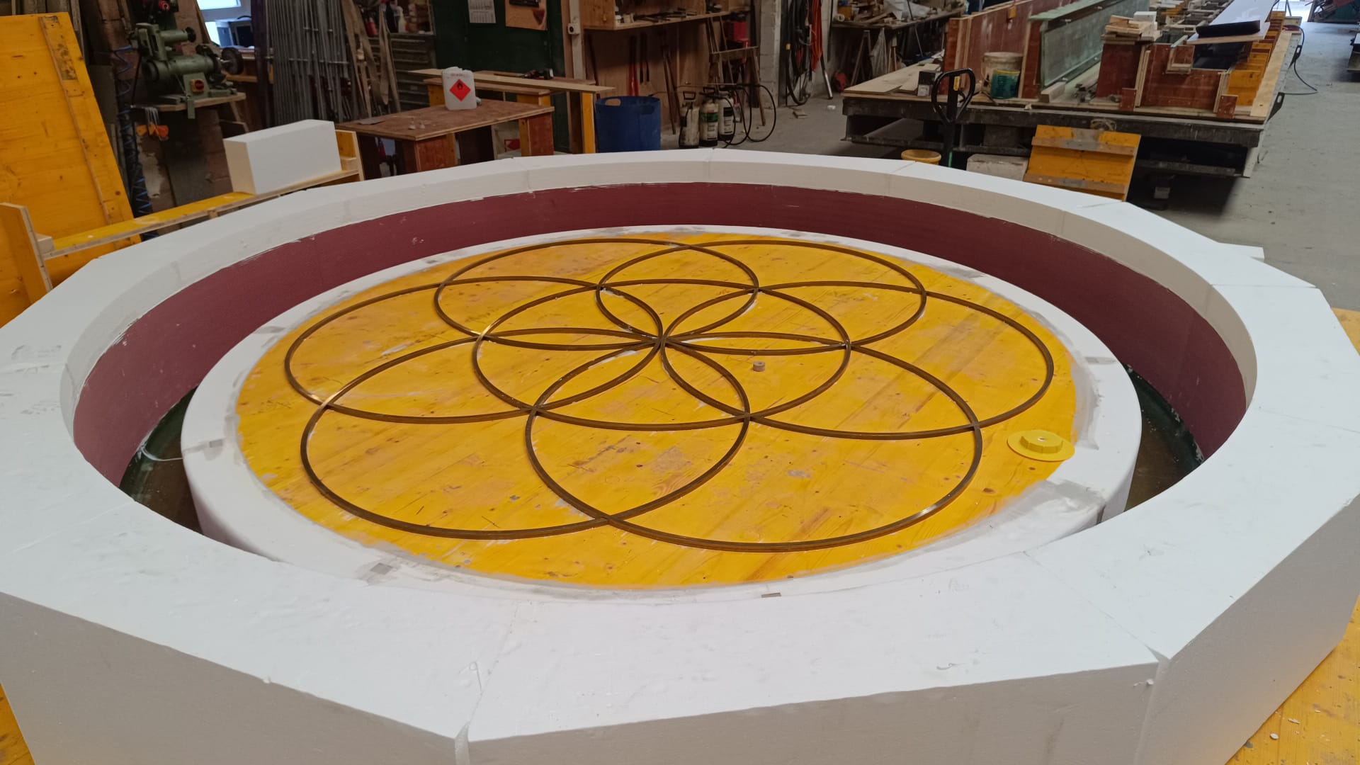 Wir durften sie bei ihrer Arbeit begleiten und haben die 3D Konstruktion erstellt, den Schalungsbau für den Beton ausgeführt, die Lieferung organisiert, sowie die Intarsien hergestellt.